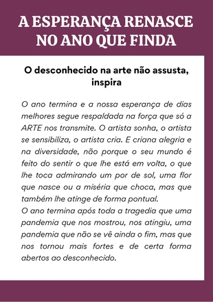 O ano termina após toda a tragedia que uma pandemia que nos mostrou, nos atingiu, uma pandemia que não se vê ainda o fim, mas que nos tornou mais fortes e de certa forma abertos ao desconhecido. Agora é seguir fazendo Arte e colorindo os tons sombrios de um mundo que queremos alegre e humano. Veja mais! >>